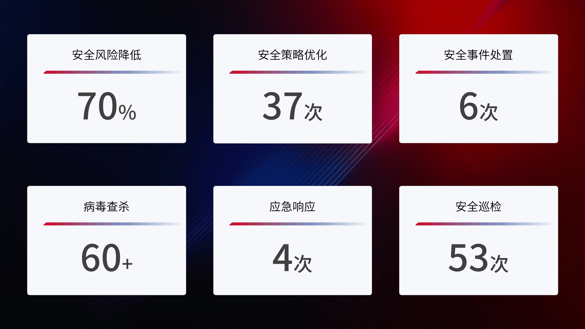 提供全面的安全事件报告体系,,包括处置报告、、、周报、、季度和年度总结,,结合持续监控,,帮助客户深入了解网络安全状况。。。。