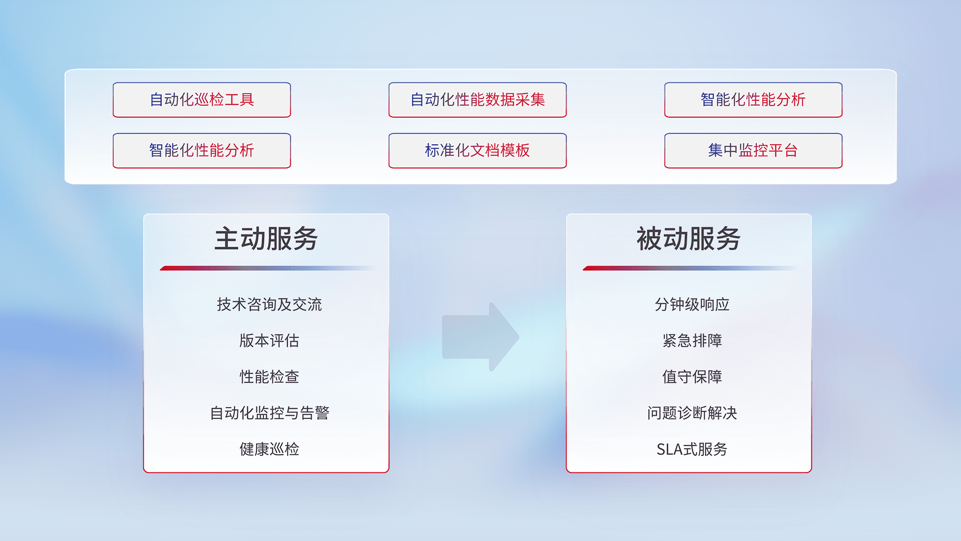 智能化工具和标准化文档,,,,保障服务质量,,,提供主动服务(包含技术咨询、、、、版本评估、、、、性能检查、、自动化监控与告警、、、、健康巡检)和被动服务包含(分钟级响应、、、、紧急排障、、、、值守保障、、、问题诊断解决、、、SLA服务)。。